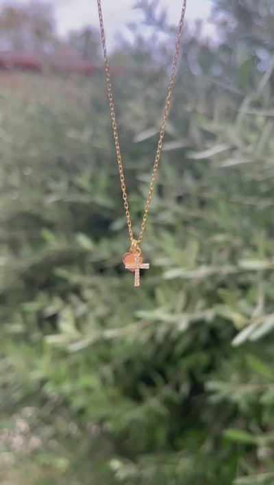 Elegantly designed gold-plated cross adorned with sparkling diamond accents and a delicate heart-shaped charm. This sophisticated piece symbolizes faith and love, making it a meaningful addition to any jewelry collection. Crafted with precision for lasting beauty and spiritual significance.